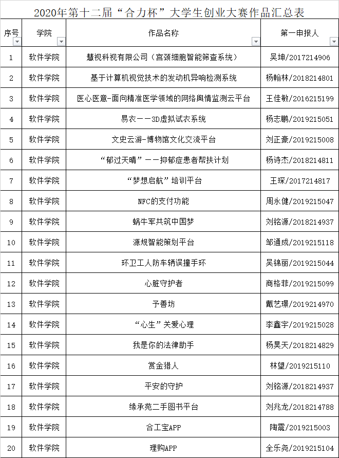根据《关于举办2020年“创青春”全国大学生创业大赛校内选拔赛的通知》,学院团委分别开展了2020年“创青春”全国大学生创业大赛项目院内选拔赛动员、预报名、作品申报、组织线上专家盲审和补交作品后,现将校内选拔赛院内作品遴选最终结果(排名按照评审结果顺序)公示如下: