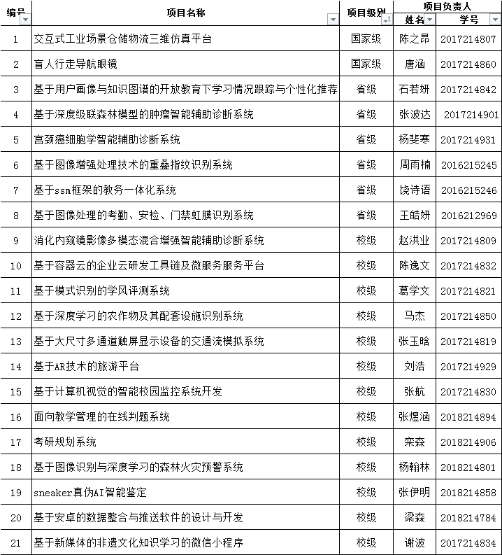 根据学校相关文件精神,各年级组织开展了2019年大学生创新创业训练计划的申报,共收到2016、2017、2018三个年级32份申报书,经学院软件工程系老师集中评审,拟推荐以下21项创新创业训练计划项目,具体情况如下:
