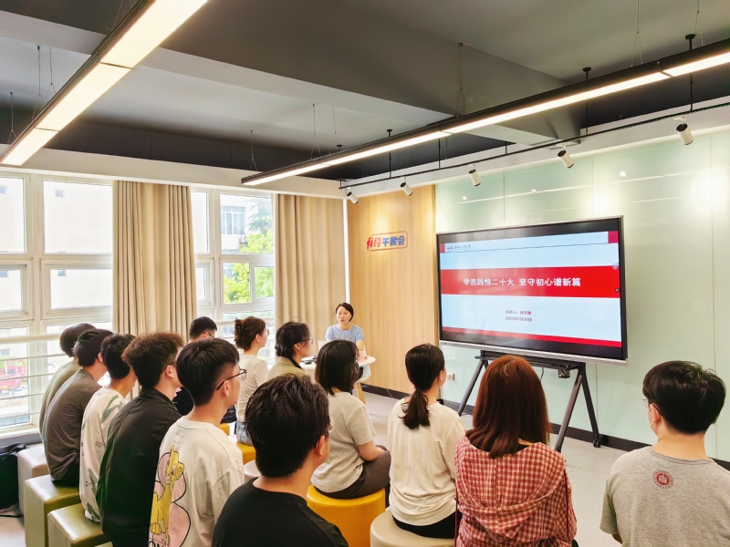 5月30日上午,必赢线路检测3003党委副书记储文静以“学思践悟二十大,坚守初心谱新篇”为题,在翡翠湖校区2号学生社区沙龙空间为学院学生第一党支部作专题党课。
