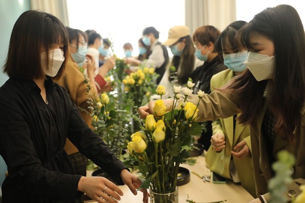 4月5日上午,必赢线路检测3003在翡翠湖校区学生生活成长社区沙龙空间举办第二期“花叶蕴美”插花艺术体验日活动。来自各学院的30名同学参加此次活动。