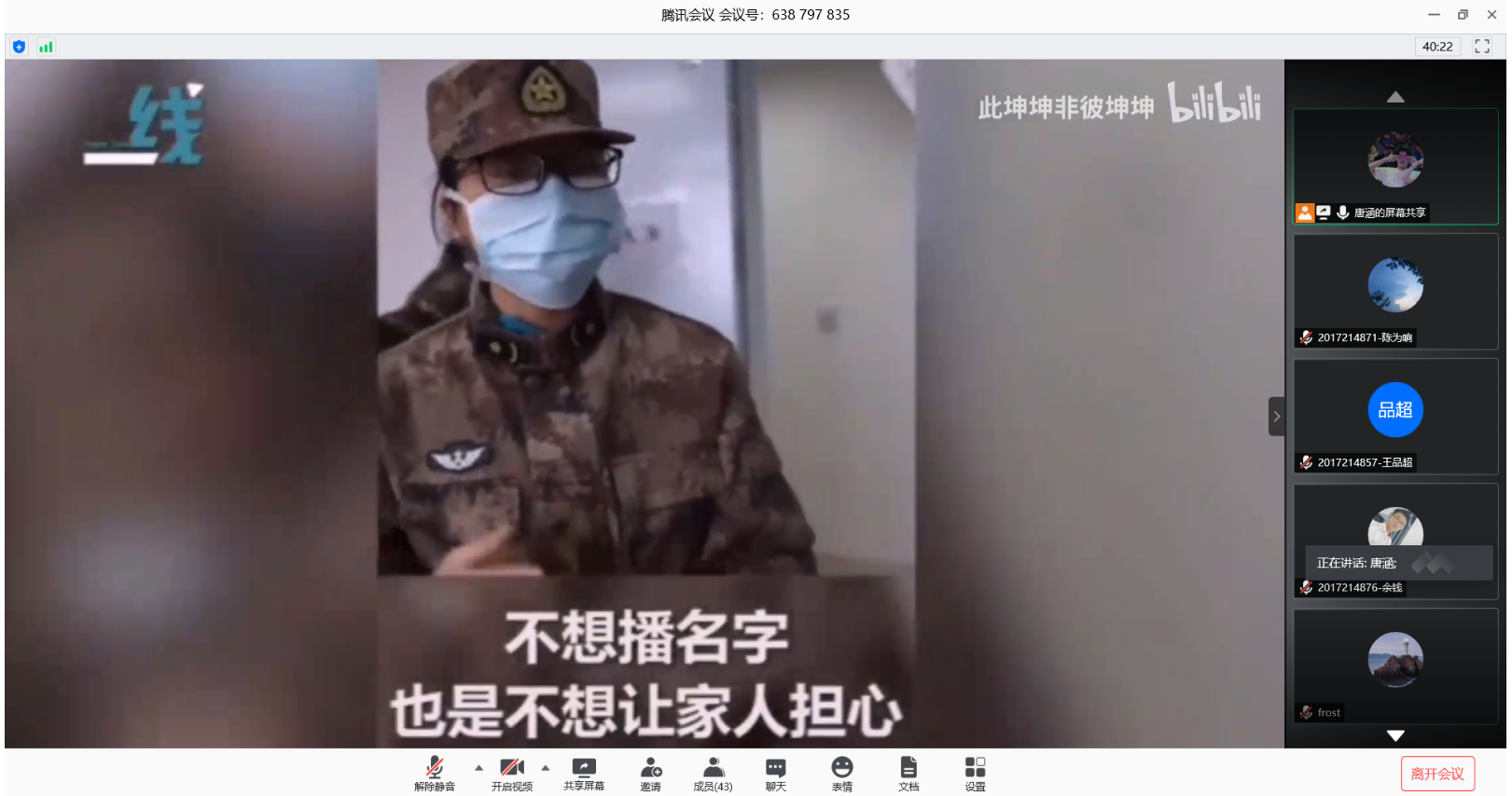 首先,唐涵同学说明了本次小班辅导的主题、流程和要求。接着介绍了5月12日这一天的特殊性,分别是汶川地震12周年和国际护士节,并带领大家观看了感恩疫情防控医护人员的视频,视频中医护人员疲惫的身影让人心疼,和亲人诀别时的场景让人潸然泪下,赞扬了白衣天使们无私奉献、英勇抗疫的精神。紧接着观看了一段关于火神山医院建设的演讲,通过视频让大家感受到火神山医院建设的不易,和中国人民团结一心、抗议救援的民族精神,同学们积极发言,表达了疫情期间自己的真实感受。最后由袁杨华老师总结本次小班辅导。