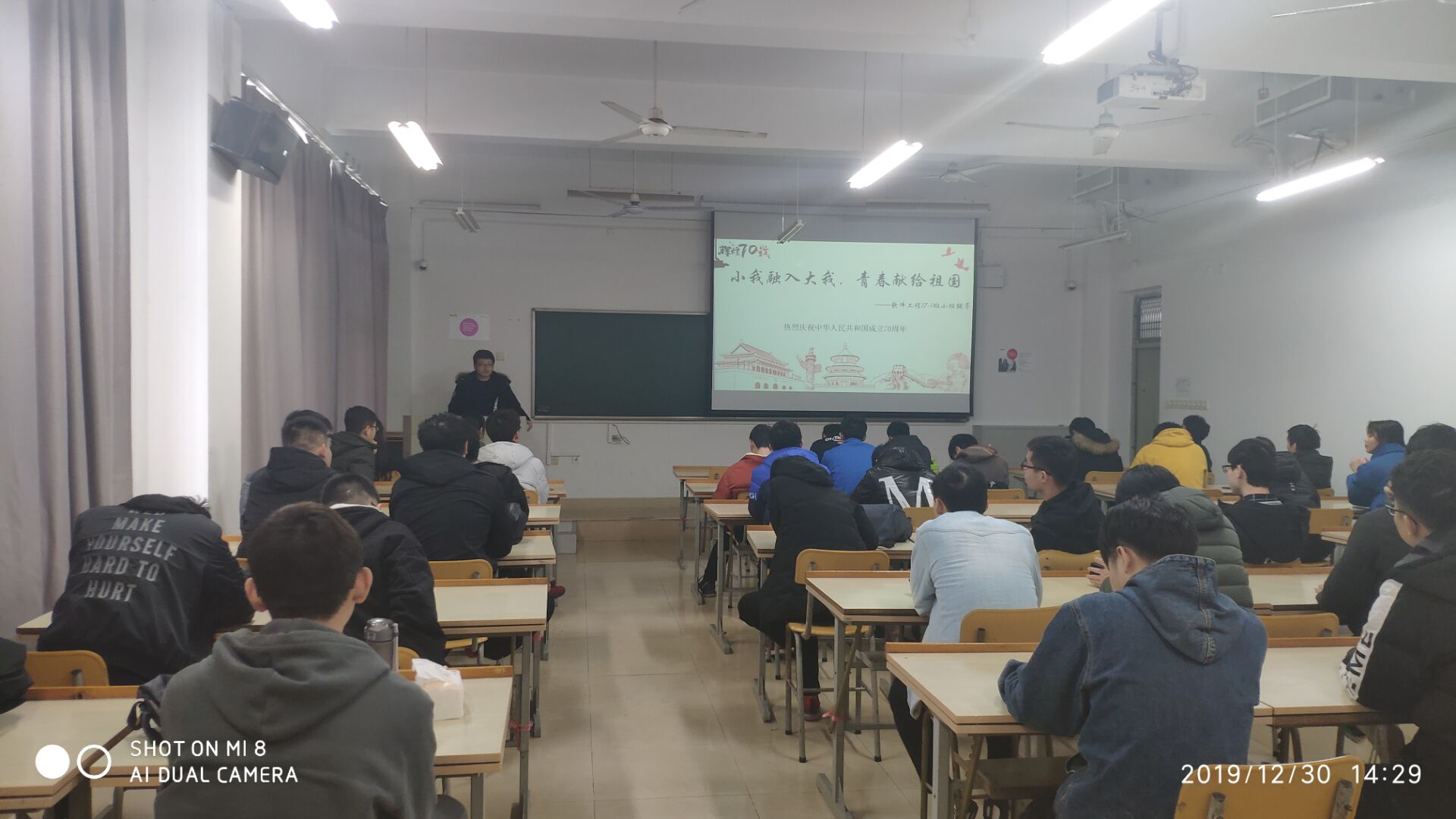 各班团支书以PPT和视频的形式,带领大家共同学习习近平总书记在庆祝中华人民共和国成立70周年大会上的重要讲话,简单回顾了70周年来我国在社会主义现代化进程中所取得的伟大成就,并分享了自己关于习近平总书记讲话的理解。随后,在自由讨论环节,各小组代表们积极发言,大家都表示当代大学生只有树立正确的爱国观念和强烈的责任担当,才能走在正确的自身发展的道路上。