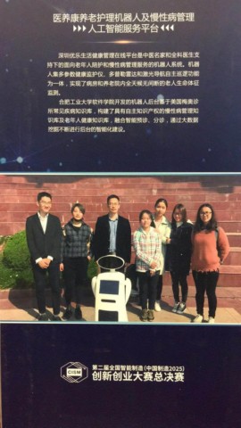 该团队所开发的机器人后台是基于美国梅奥诊所常见疾病知识库,构建了具有自主知识产权的慢性病管理知识库及老年人健康知识库,融合智能预诊、分诊,通过大数据挖掘不断进行后台的智能化建设。团队于11月30日获得“全国智能制造(中国制造2025)创新创业大赛”华南赛区人工智能专项赛第三名而进入全国总决赛。