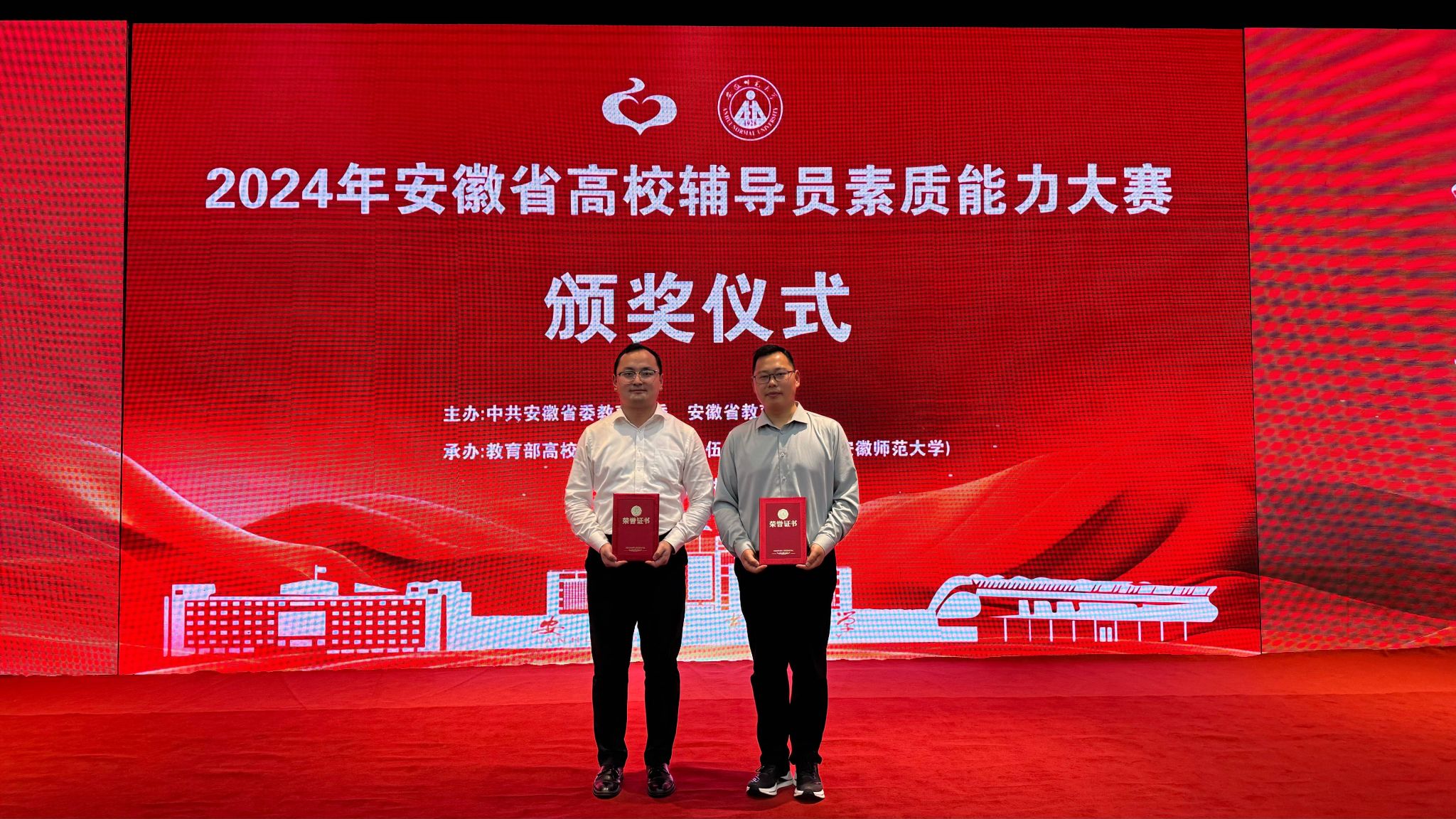 5月9日至11日,2024年安徽省高校辅导员素质能力大赛在安徽师范大学举行。学院辅导员邢松荣获一等奖,展示出学校辅导员优秀的综合素质、精湛的职业技能和昂扬的精神风貌。