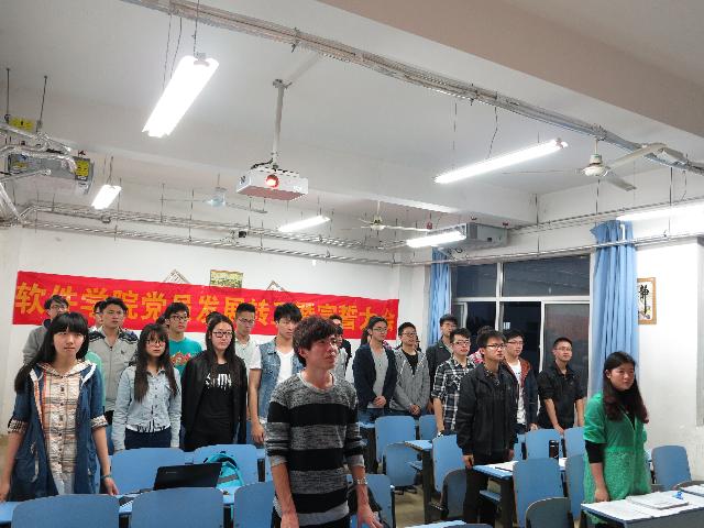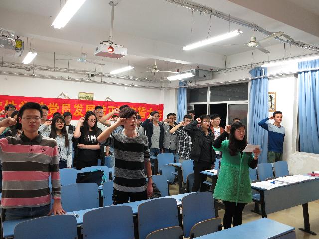 2015年4月25日晚,必赢线路检测3003学生党支部党员转正、发展及宣誓大会在翡翠湖校区6教110顺利召开。党支部书记郑华老师及全体在校党员参加了本次会议。大会主要讨论李姣姣等4名预备党员的转正问题,韩伟等8位同志的发展问题暨新老党员宣誓仪式。