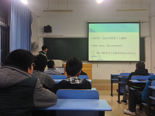 接下来杨部长又简单介绍了JAVA的一些特性,例如write once, run anywhere,还有JAVA面向对象的特性等。接下来就正式开始讲解JAVA的语法,主要与同学们已经比较熟悉的C++做了对比,在讲解同时还经常提出一些问题以加深同学们的理解。同时在休息是还放了一些关于JAVA的微电影,加强了同学们的兴趣。通过对JAVA语言的特性的讲解,让同学们掌握了不少JAVA语言的知识。