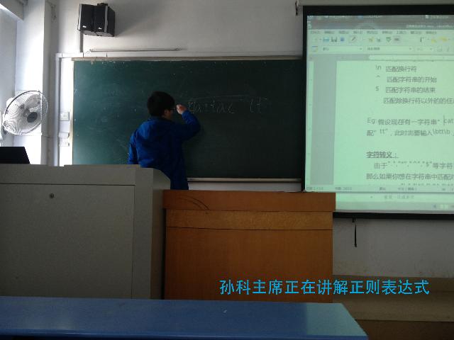 然后进入了本次培训的正题,这次是由孙科主席讲解正则表达式。孙科主席结合实例对正则表达式的语法进行了详尽的讲述,为同学们的进一步学习打下了基础。