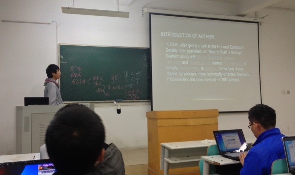 本次培训由信息部长杨润青主持。首先,他向大家简单介绍了自己最近在看的一本书《hacker and painter》,并表达了他的个人观点:这本书值得一读。